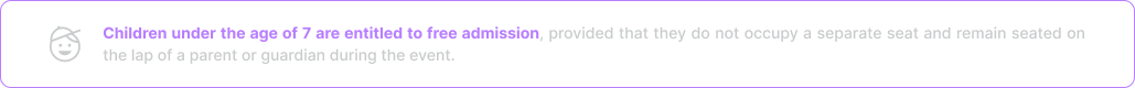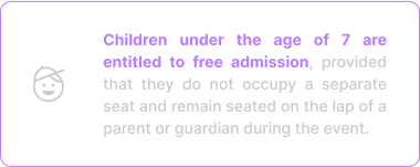Admission for children under 7 years of age is free of charge. The organizer does not provide a separate seat for children of this age group. Children must be accompanied by a parent or guardian and may only be seated on their lap.