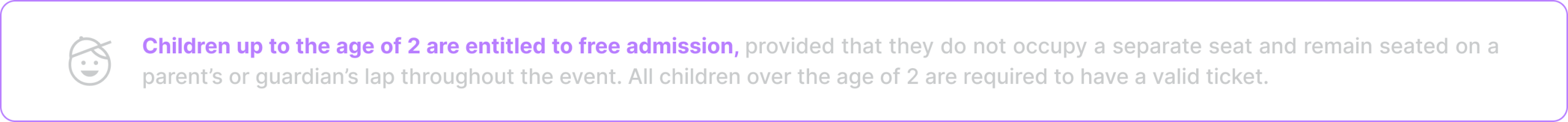 Children up to the age of 2 are entitled to free admission, provided that they do not occupy a separate seat and remain seated on a parent’s or guardian’s lap throughout the event. All children over the age of 2 are required to have a valid ticket..
