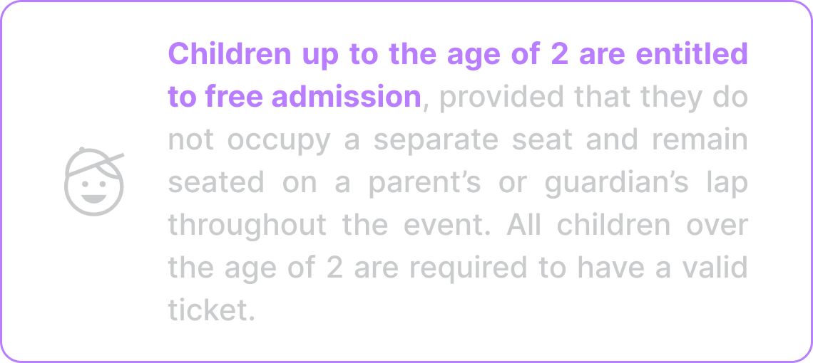 Children up to the age of 2 are entitled to free admission, provided that they do not occupy a separate seat and remain seated on a parent’s or guardian’s lap throughout the event. All children over the age of 2 are required to have a valid ticket.